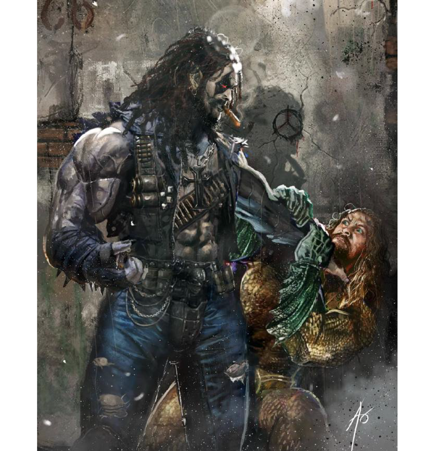 Rudy Ao 的作品,巧妙地將畫面主角替換為「宇宙最惡名昭彰的賞金獵人」暴狼(Lobo)與「七海之王」水行俠(Aquaman)。乍看之下,這只是單純的角色替換,但深入探究,這幅藝術圖所帶來的化學反應卻令人拍案叫絕。原版中,被毒藤女心靈控制的超人與盡力挽救朋友的蝙蝠俠,兩者之間的對決充滿了情感上的矛盾與悲劇性。而當主角換成暴狼與水行俠,那種「悲劇英雄」的底色瞬間被瓦解。暴狼是個唯我獨尊、毫無道德底線的瘋子,他的暴力不是因為被迫,而是發自內心的純粹喜愛。水行俠雖然貴為王者,但在漫畫世界中也常常被視為一個充滿爭議和被惡搞的對象。