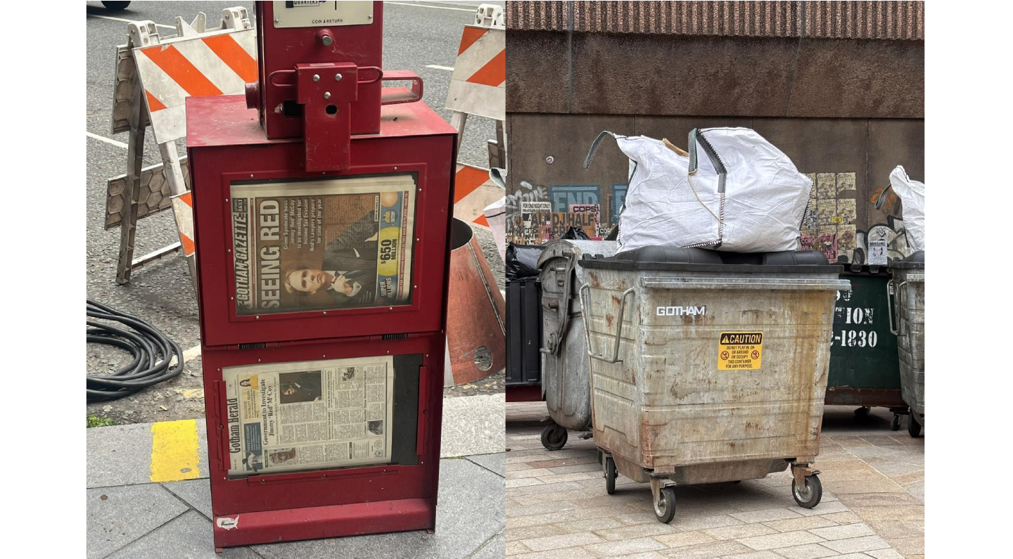 最畫龍點睛的,莫過於那個鮮紅色的《高譚公報》(Gotham Gazette)報紙販賣機。報紙頭條赫然寫著「見紅」(Seeing Red),副標題則是:「犯罪集團頭目吉米·『紅人』·麥考伊因逃漏所得稅將被調查」。這個細節的訊息量極大:首先,它確立了高譚市存在著有組織的犯罪集團;其次,「逃漏稅」這個罪名,讓人立刻聯想到現實世界中,如艾爾·卡彭等黑幫大佬的倒台方式,為電影的罪案故事線,注入了強烈的寫實主義色彩。