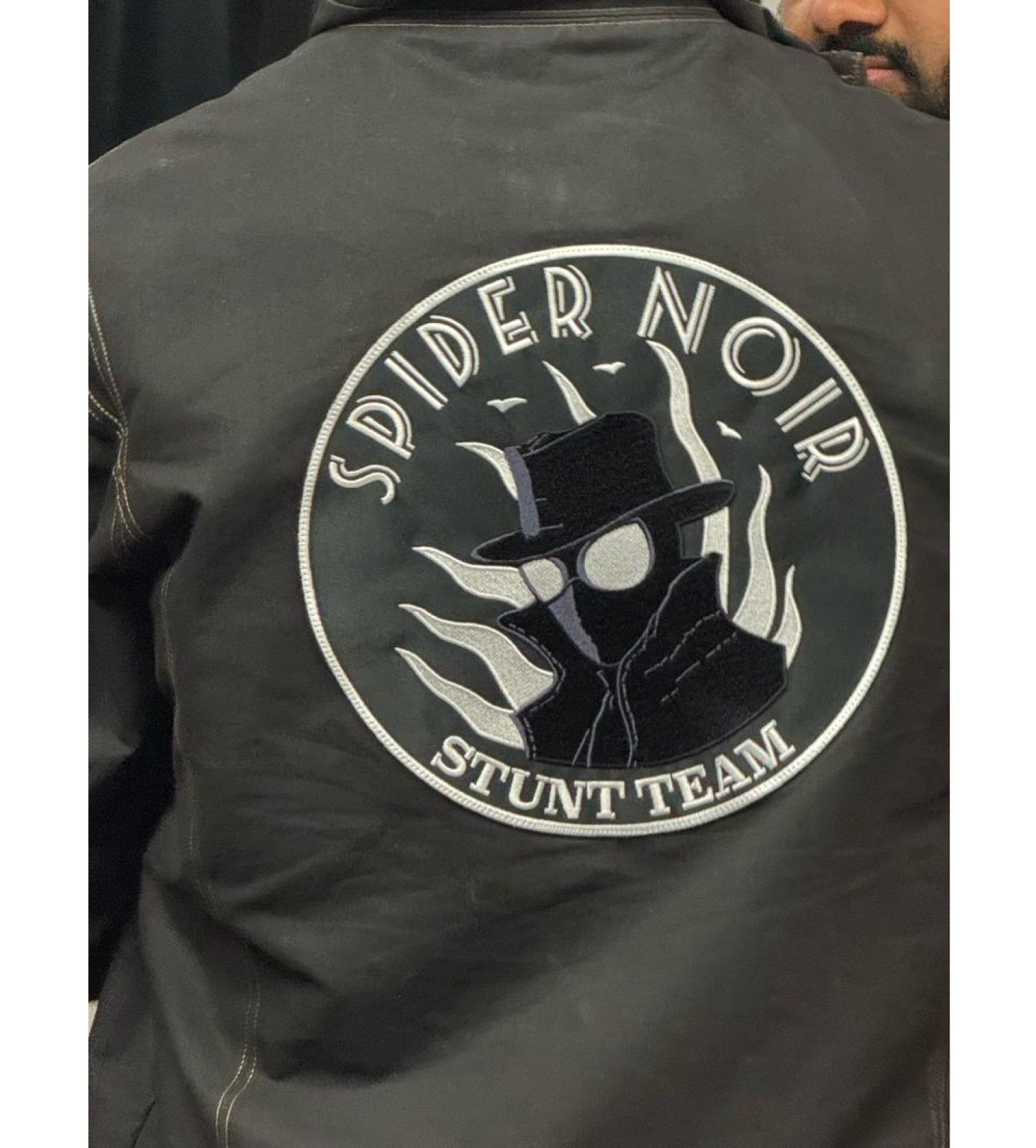 這張由X用戶@DisneyScoopGuy分享的照片,是一件屬於劇組「特技團隊」(Stunt Team)的黑色外套。而在外套背面的圓形Logo中央,赫然印著凱吉版「暗影蜘蛛人」的半身像。這個設計,雖然僅是Q版的圖樣,卻已足夠,讓我們,清晰地,窺見這部影集的視覺風格與角色樣貌。