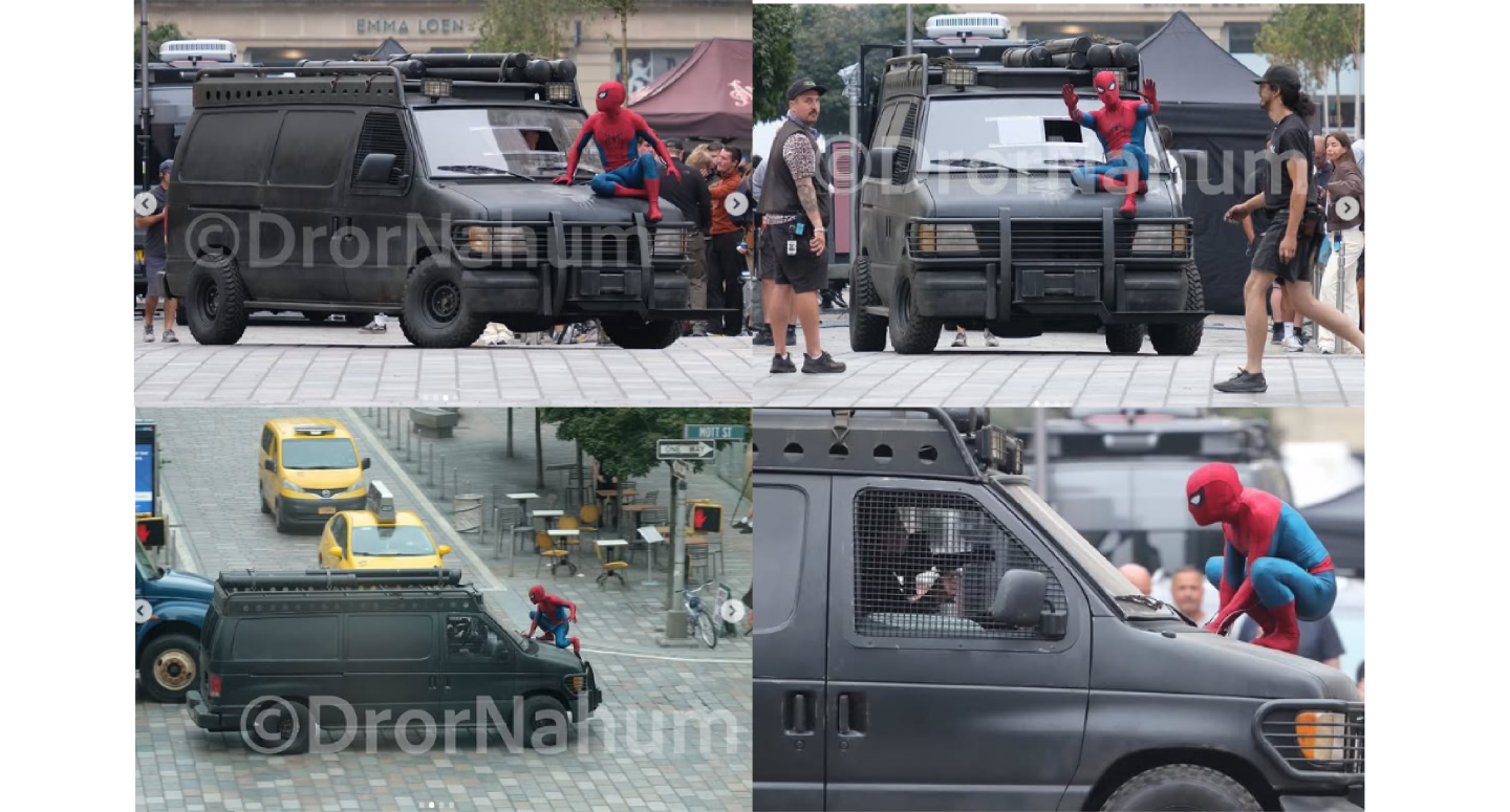 格拉斯哥街頭化身為紐約市,捕捉到震撼人心的畫面:穿著嶄新紅藍戰衣的蜘蛛人,英勇地站立在制裁者那輛全面升級的戰鬥廂型車頂上。兩人正展開一場高速追逐,目標直指片場多次曝光的神秘坦克。