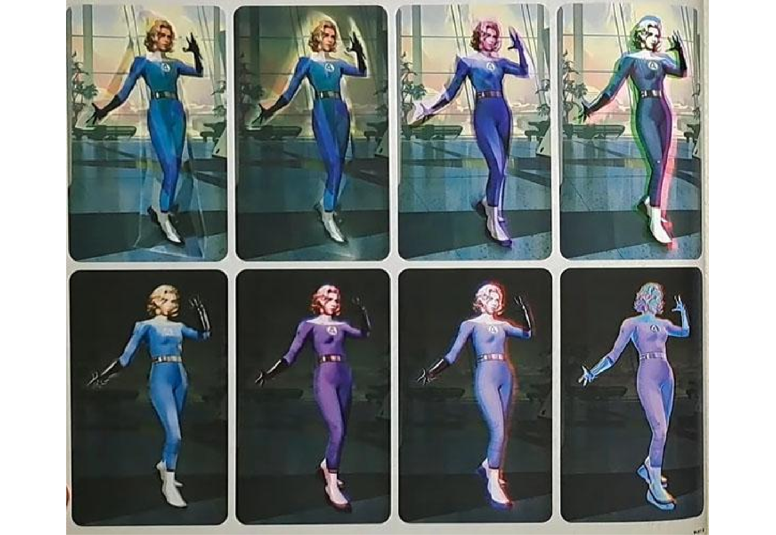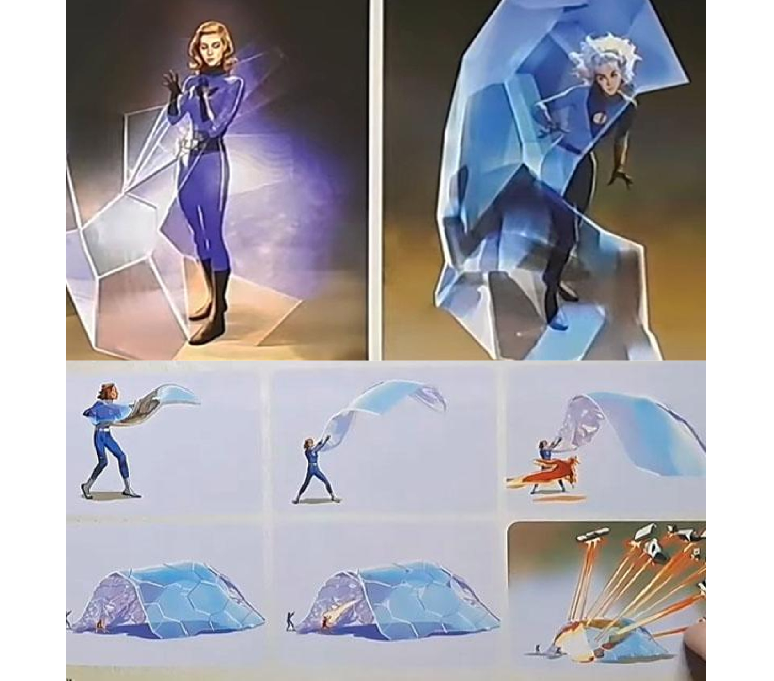 韋斯·伯特展出了多款令人驚嘆的概念設計圖,其中蘇的力場並非單純透明,而是如玻璃或大理石般晶瑩剔透,皮膚與空氣折射出晶體般的光澤,宛如精緻的透明雕塑,既堅硬又優雅,完美詮釋了守護者的堅毅與母性的光輝。然而,這種「鑽石化」的視覺效果與《X戰警》中「白皇后」艾瑪·佛斯特(Emma Frost)的鑽石形態過於相似。考量到《X戰警》即將加入MCU,漫威為避免角色形象混淆,最終未採用此設計,使其成為一件藝術價值極高的遺珠之作。