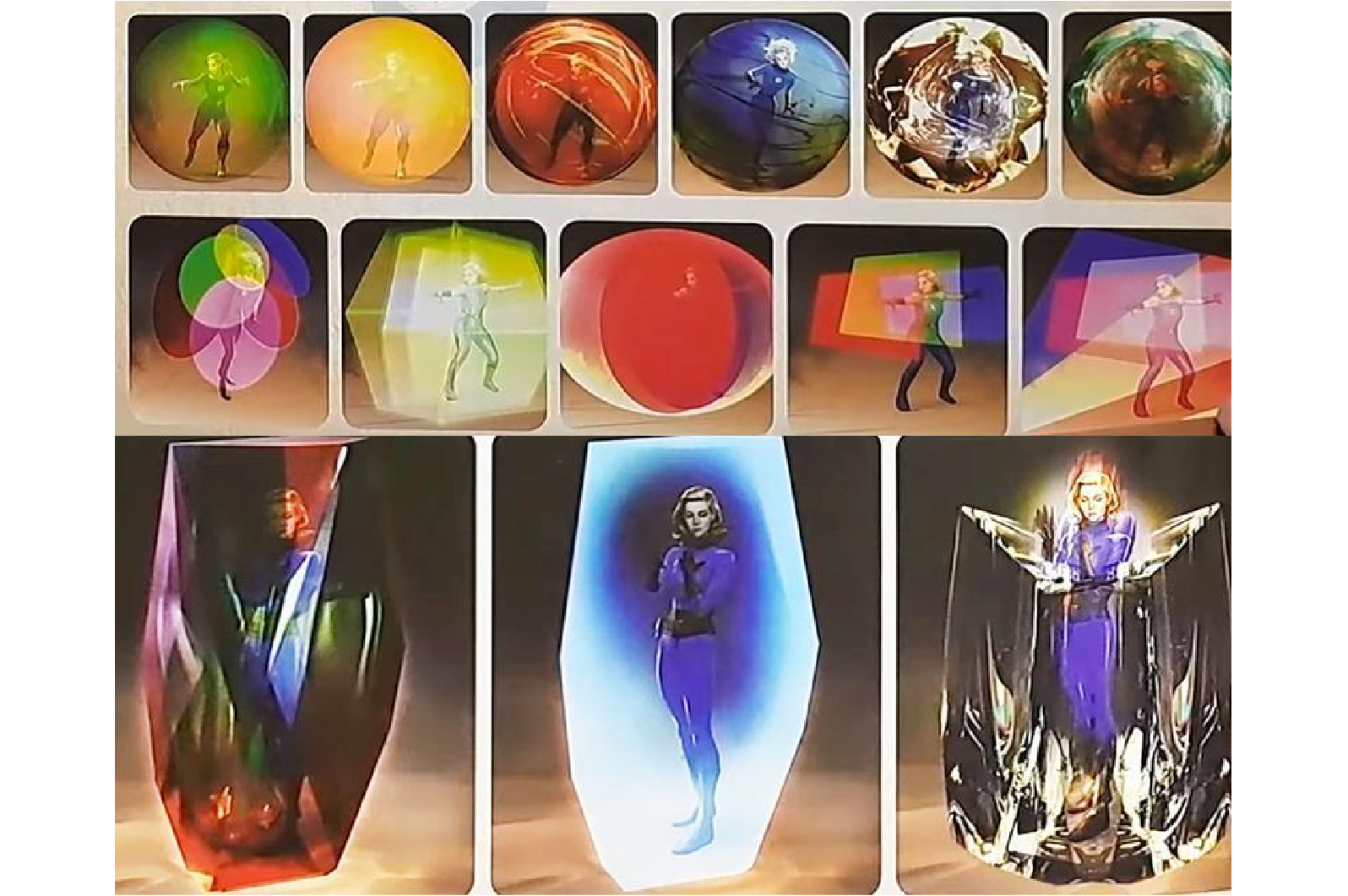 若玻璃質感強調物理防禦,另一種設計則向影史經典致敬。導演夏克曼多次提到,本片的視覺靈感來自1968年《2001太空漫遊》及其導演史丹利·庫柏力克(Stanley Kubrick)。蘇的能力被抽象化為RGB光譜的分解,光線穿透力場時如同經過稜鏡折射,呈現出紅、綠、藍三色光暈,迷幻且充滿60年代「普普藝術」(Pop Art)與「歐普藝術」(Op Art)的風格,將隱形能力轉化為光的操控。雖然電影保留了部分光影折射效果,但強烈的RGB分色風格在一定程度上犧牲了畫面的清晰度。