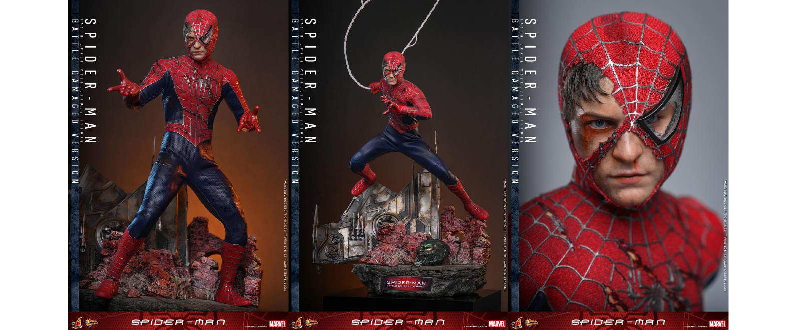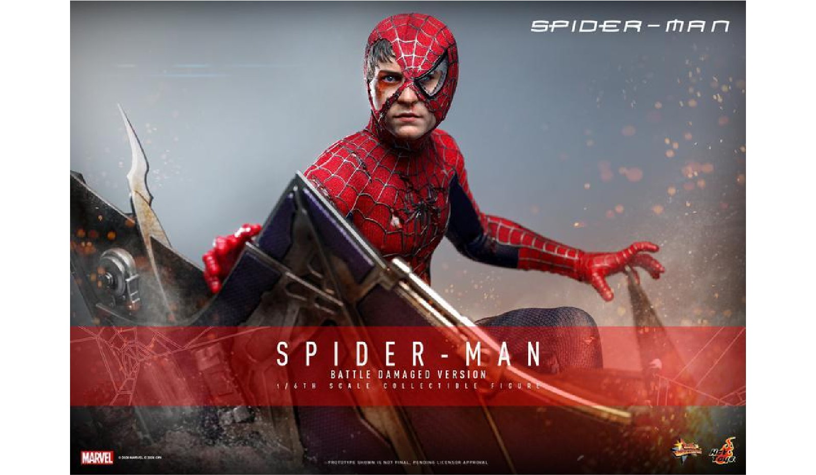 從漫畫角度來看,此戰役靈感源自銀青銅時代的黑暗風格,並借鑑了1973年Gerry Conway所創作的《關·史黛西之死》故事線中,蜘蛛人對綠惡魔的深刻仇恨(電影中則改為瑪莉·珍)。電影結尾,彼得拒絕接受綠惡魔的謊言,目睹如同父親般的重要人物死於自己所製造的武器,這段心理創傷奠定了陶比蜘蛛人獨特的憂鬱氣質。Hot Toys將這一刻實體化,向「英雄必先受難」的古典敘事致敬。這款人偶提醒我們:陶比蜘蛛人之所以經典,不在於他的強大,而在於他即使傷痕累累,依然堅強站立。