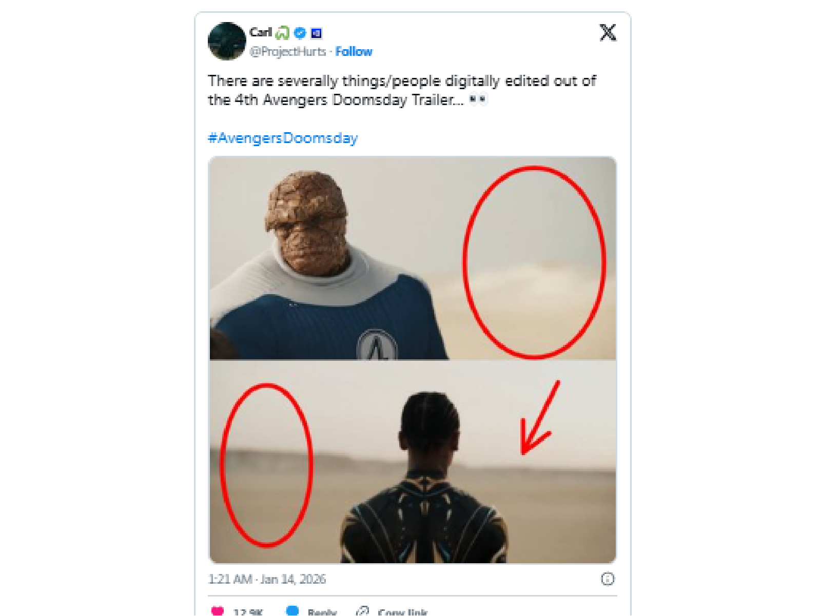 漫威影業與全球粉絲之間,總有一種甜蜜又狡猾的微妙關係:「你信了算我輸!」就在《復仇者聯盟:末日崛起》第四支也是最後一支預告釋出後,網路偵探們立刻嗅出熟悉的「造假」味道。這支預告聚焦瓦干達的舒莉、恩巴庫,還有驚奇四超人的「石頭人」班·格林,但畫面中那些怪異的構圖、不合邏輯的空白,以及角色目光的落點,瘋狂暗示漫威又偷偷把關鍵角色給P掉了!