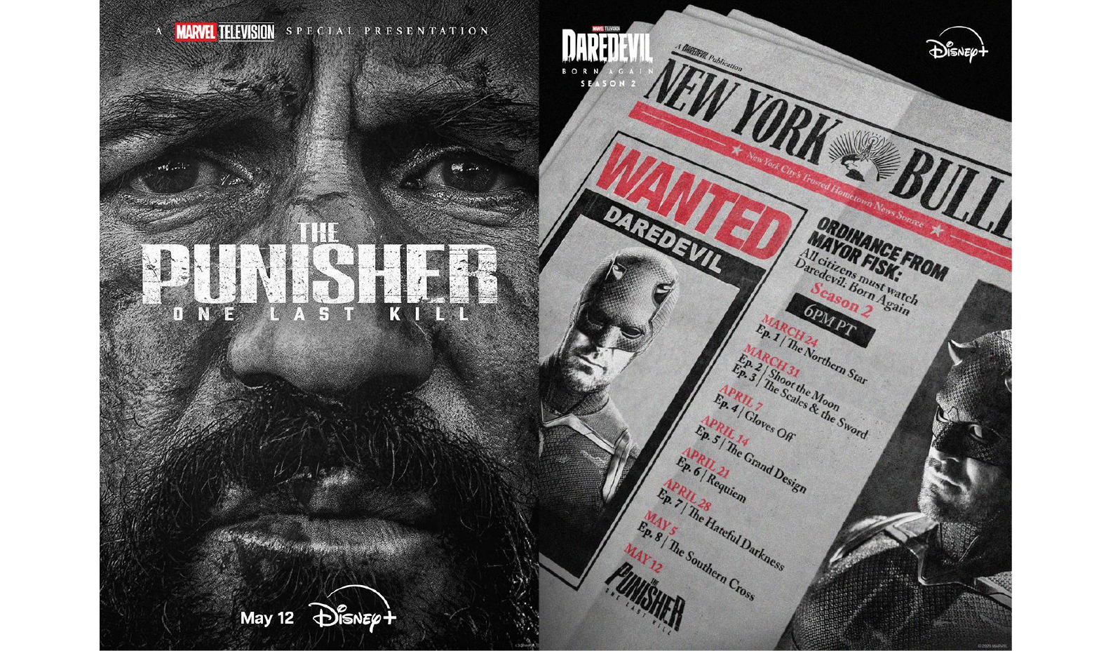 漫威這次的戰術簡直瘋狂!就在《夜魔俠:重生》第二季上線之際,官方大刀闊斧調整了釋出時程。除了首播第一集「北方之星」外,最讓粉絲瘋狂的是3月31日將連播「射月」與「天秤與劍」兩集!打破原本單集節奏,劇情將以核彈般的速度狂飆。同時,官方亮出底牌:主打TV-MA級極致暴力的特別篇《制裁者:最後一殺》,確認在5月5日第八集大結局後,於5月12日強勢接檔!這意味著法蘭克雖然缺席本季的紐約大戰,但他的血腥私刑絕對會為這場街頭史詩畫下最殘酷的句點!