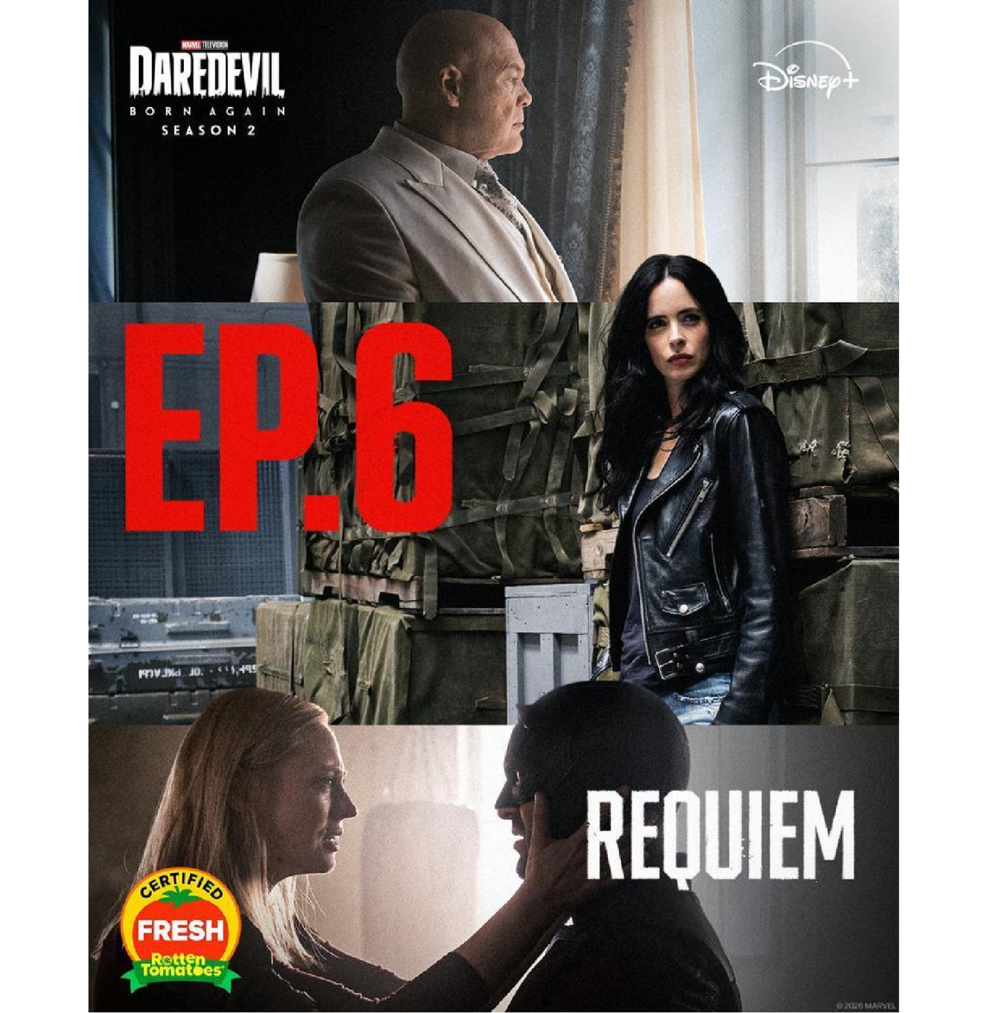 官方社群帳號發布了最新宣傳圖,正式確認由克萊斯汀·瑞特飾演的潔西卡瓊斯,將在 4 月 21 日播出的第六集「Requiem」中現身。宣傳圖中,穿著招牌黑色皮夾克的潔西卡倚靠在軍火箱旁,與白西裝的金霸王、以及戴著頭盔的馬修、凱倫形成強烈對比。這是該角色自 2019 年《潔西卡瓊斯》第三季完結後,睽違近七年首度回歸真人影視作品,預告片更暗示她心中仍受宿敵「紫人」的幻聽所苦。