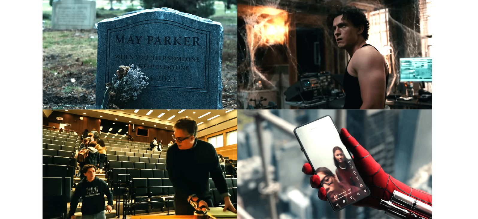 這次預告重點鎖定了四大關鍵場景:首先是漫畫迷最熟悉的帝國州立大學(ESU),彼得正式在此展開大學生涯;接著是他四年來獨自居住的紐約小公寓,內部裝潢比起《無家日》片尾更有生活氣息;第三則是梅嬸的墓碑,彼得至今仍會定期探視,顯示他內心深處的羈絆;最後則是 MJ 與奈德就讀的麻省理工學院(MIT)。這四個地點構成了《重生日》的核心地圖,精準交代了彼得在被遺忘後,是如何在社會邊緣與學生身份間掙扎求生。
