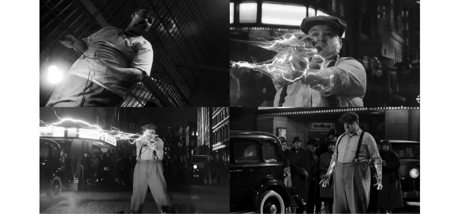 阿哥我認為,劇組選擇「百萬瓦」而非家喻戶曉的電光人,是一手非常高明的「角色去神格化」策略。電光人的設定通常帶有太重的現代科技感,並不符合 1933 年那種充滿煙塵、酒精與絕望的黑白電影基調。相反地,百萬瓦那種「落魄演員」的悲劇色彩,完美契合了尼可拉斯凱吉提到的《唐人街》式幻滅感。與其看一個想統治電網的工程師,我們更想看一個為了在聚光燈下活下去而不擇手段的瘋狂演員。阿哥我只能說,這種將「表演慾」轉化為犯罪動力的設定,才是最符合 Noir 靈魂的人性毒藥。