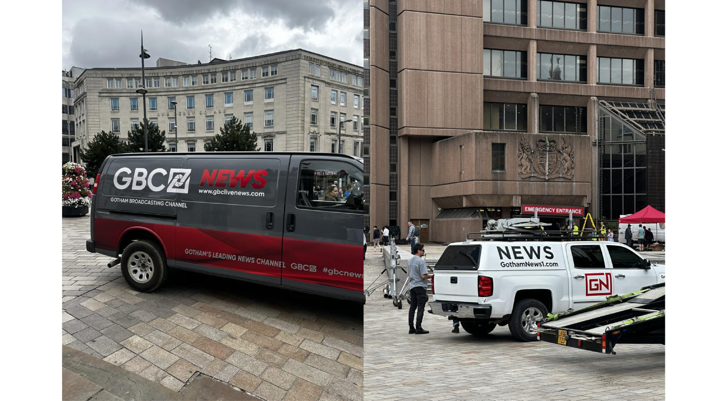 這些來自英國利物浦片場的照片,將我們直接帶入了DCU高譚市的街頭。其中,「伊莉莎白二世法院」大樓的存在,暗示了這座城市的法律與秩序體系將是故事的核心舞台。然而,真正定義這座城市氛圍的,是環繞著法院的那些「城市皮膚」。印有「gothamnews1.com」與「高譚廣播頻道」字樣的新聞採訪車,昭示著這是一個媒體無孔不入、時刻準備將悲劇轉化為頭條新聞的現代都會。這與《泥面人》主角麥特·哈根從明星淪為怪物的悲劇故事,形成了完美的互動。