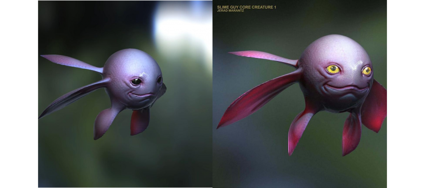 這個被刪除的角色,在設計階段,被稱為「史萊姆人」(slime guy)。根據Marantz的描述,最初的構想,是創造一個巨大的、半透明的史萊姆狀生物,而在這個生物的「核心」,將會漂浮著一個更小的、如同駕駛員般的「核心生物」。而這次被曝光的,正是這個「核心生物」的設計圖。
