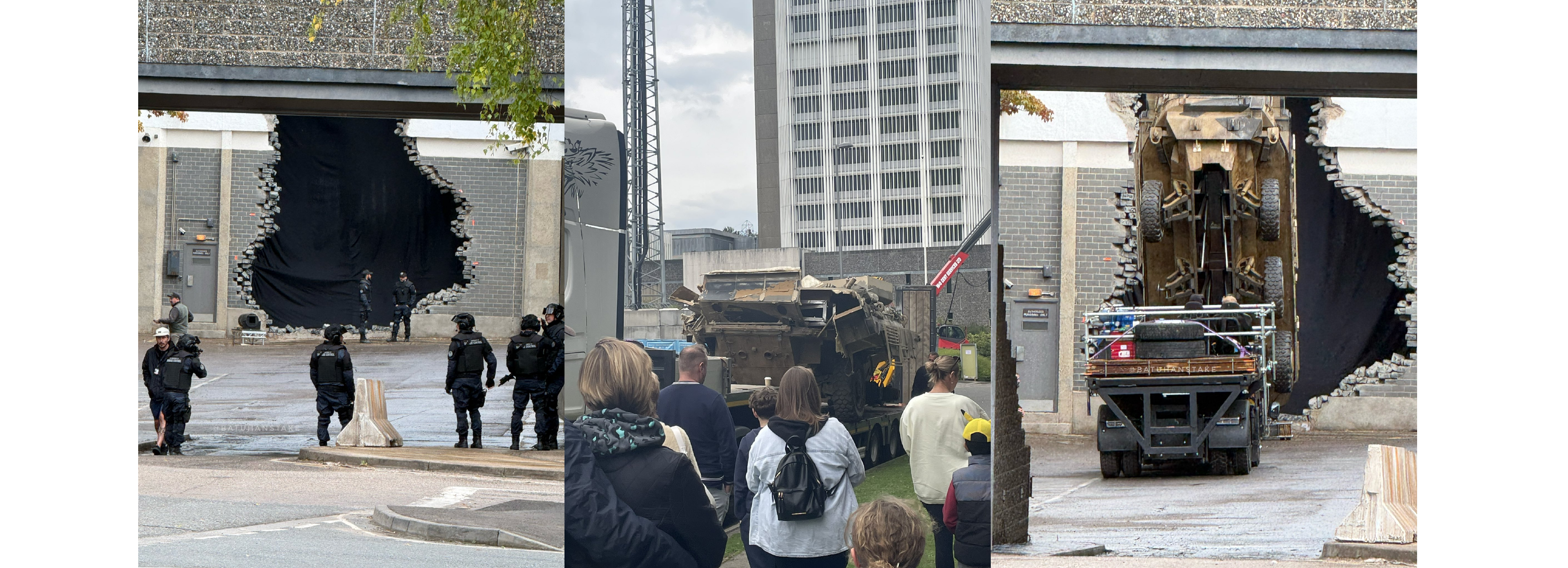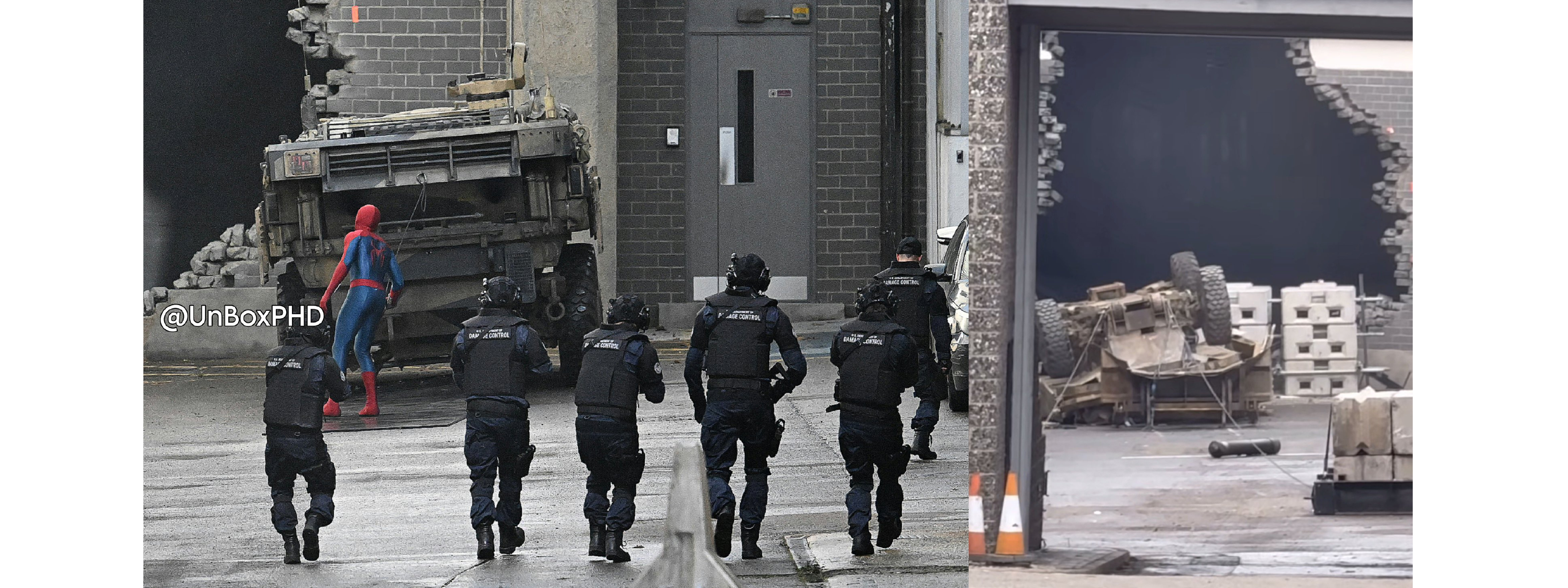 這批最新的片場照,將拍攝場地,從蘇格蘭的格拉斯哥,轉移至了英國的貝辛斯托克。而劇組,在此地,搭建了一個全新的關鍵場景——一座隸屬於「損害控制部」(Department of Damage Control, DODC)的監獄。從現場被摧毀的磚牆、全副武裝的DODC官員,以及那輛,在過去幾週的片場照中,反覆出現的、如今已然翻覆損毀的神秘裝甲坦克來看,一場大規模的「監獄暴動」或「越獄」事件,幾乎可以肯定,將是電影中的一場重頭戲。