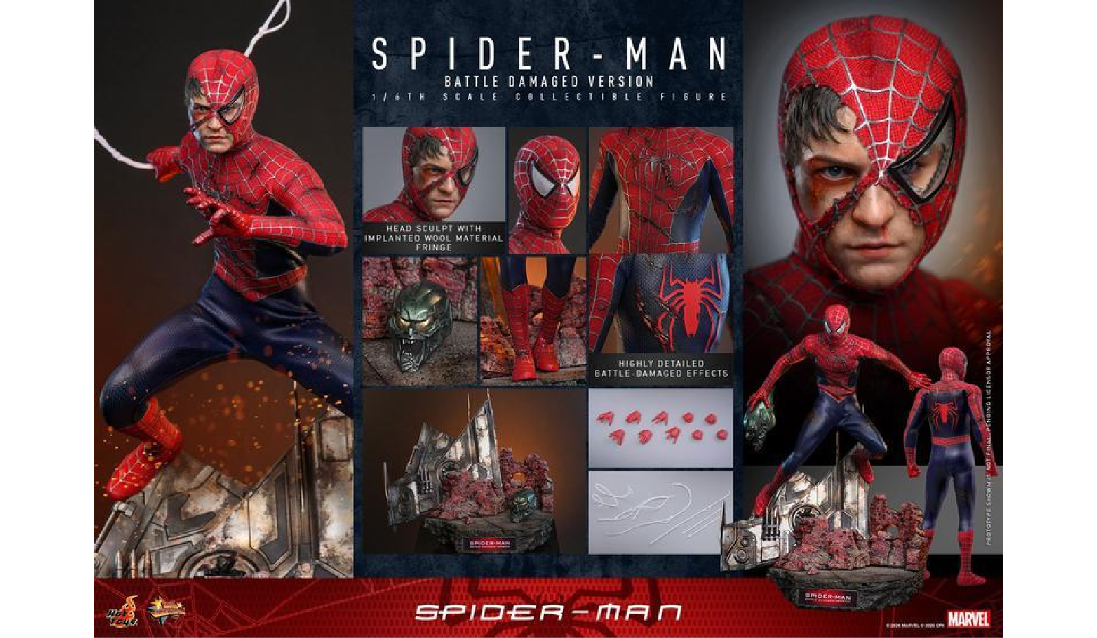 從漫畫角度來看,此戰役靈感源自銀青銅時代的黑暗風格,並借鑑了1973年Gerry Conway所創作的《關·史黛西之死》故事線中,蜘蛛人對綠惡魔的深刻仇恨(電影中則改為瑪莉·珍)。電影結尾,彼得拒絕接受綠惡魔的謊言,目睹如同父親般的重要人物死於自己所製造的武器,這段心理創傷奠定了陶比蜘蛛人獨特的憂鬱氣質。Hot Toys將這一刻實體化,向「英雄必先受難」的古典敘事致敬。這款人偶提醒我們:陶比蜘蛛人之所以經典,不在於他的強大,而在於他即使傷痕累累,依然堅強站立。