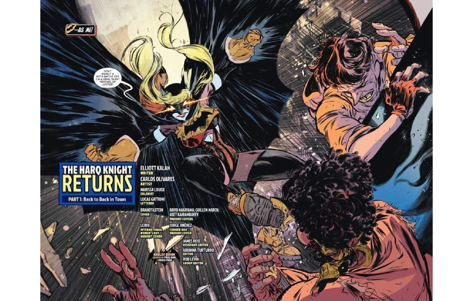 在DC漫畫宇宙大事件「DC K.O.」的餘波中,由畫師Carlos Olivares與編劇Elliott Kalan聯手打造的《哈莉奎茵》第60期投下震撼彈。劇情設定哈莉奎茵吸收殘餘的「奧米加能量」,突變成黑暗暴力的新制裁者人格——Batquinn(蝙蝠奎茵),官方戲稱她為「哈蝙騎士」(Harq Knight)。然而,這套戰袍設計引發爭議:官方直接以她招牌的紅黑緊身衣為底,硬套上蝙蝠俠的全黑披風與頭罩,胸口甚至隨意縫上一塊撕下的蝙蝠標誌。這種粗糙拼接風格被讀者痛批毫無美感,簡直是廉價的視覺惡作劇。