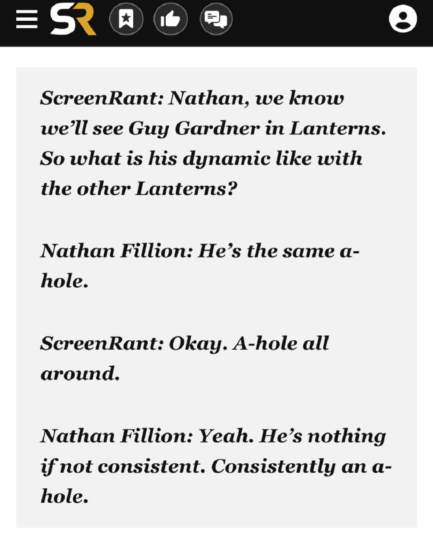 備受期待的HBO影集《綠光戰警》(Green Lanterns)再添話題,飾演蓋·加德納(Guy Gardner)的演員奈森·菲利安(Nathan Fillion)近日公開表示,他將忠於原著,把這位綠光戰警塑造成一個「始終如一地是個混蛋」(Consistent Asshole)。此番言論不僅引發粉絲熱議,更引發業界對於超級英雄角色塑造趨勢的思考。